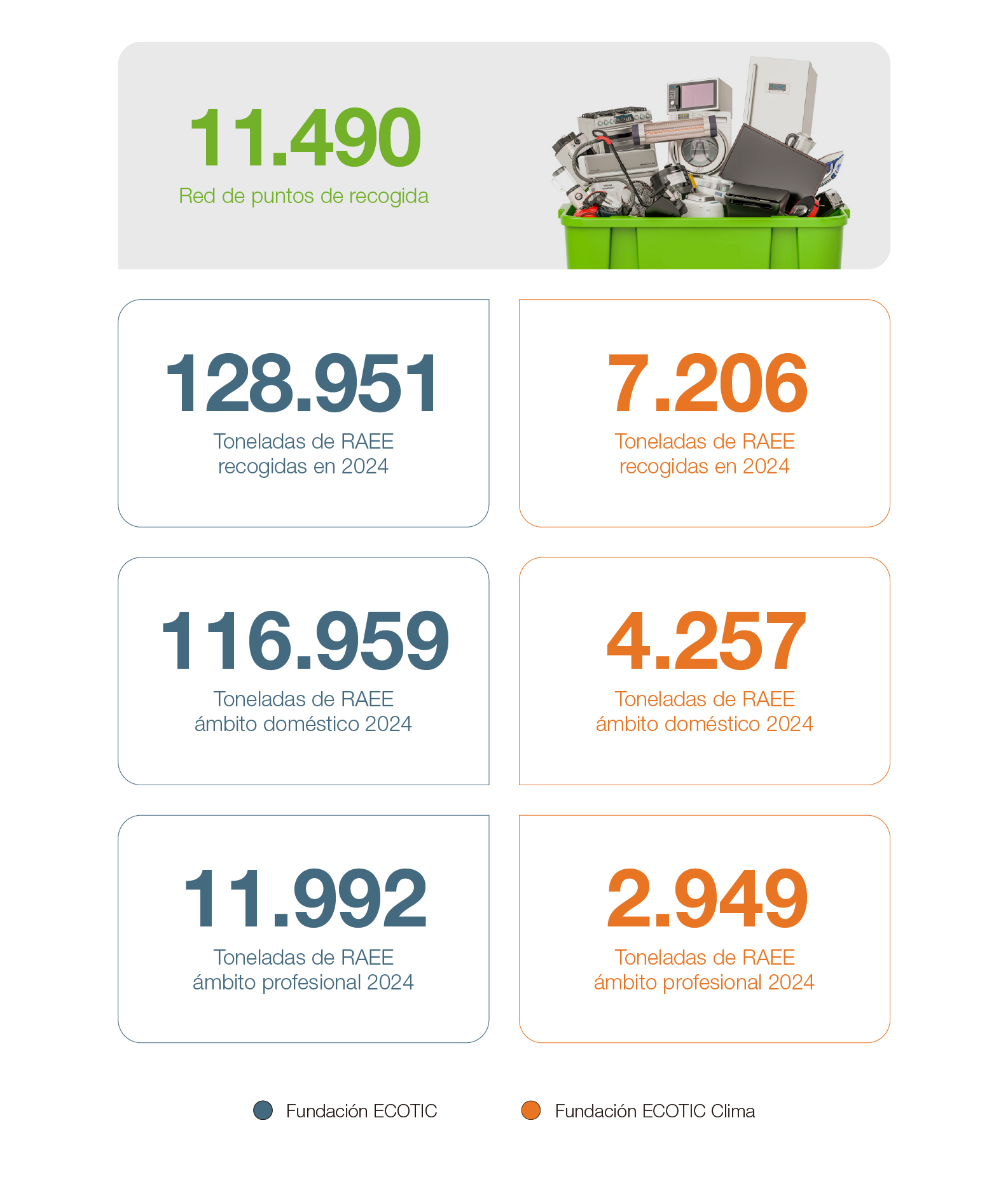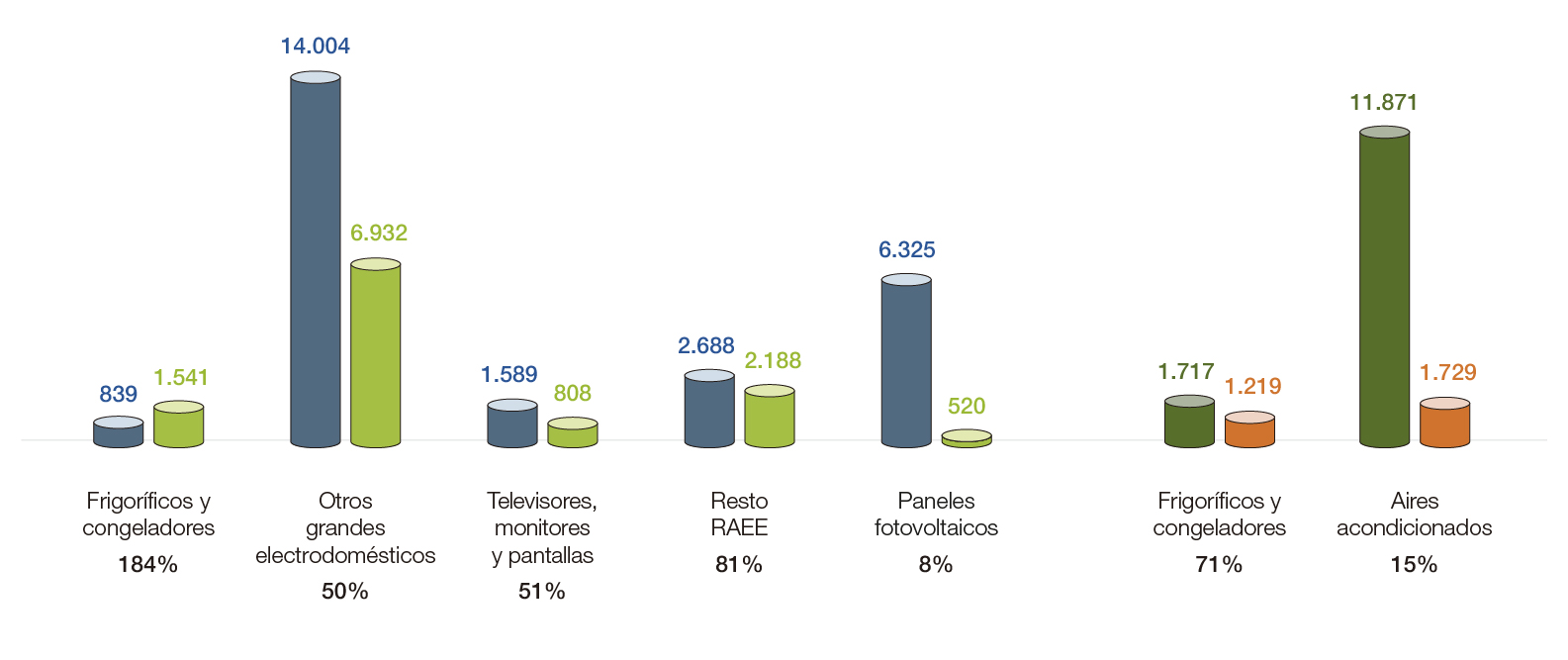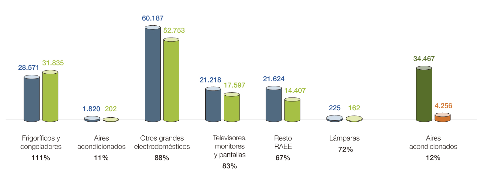 En el ámbito doméstico, alcanzamos un 87,51% de cumplimiento, aunque este porcentaje se ve afectado por las dificultades habituales a las que tenemos que enfrentarnos en la gestión de residuos de aires acondicionados, cuyos niveles de recogida están considerablemente por debajo de otras categorías de RAEE. En el ámbito profesional, el cumplimiento de objetivos se mantiene alrededor del 50%, similar al año anterior.